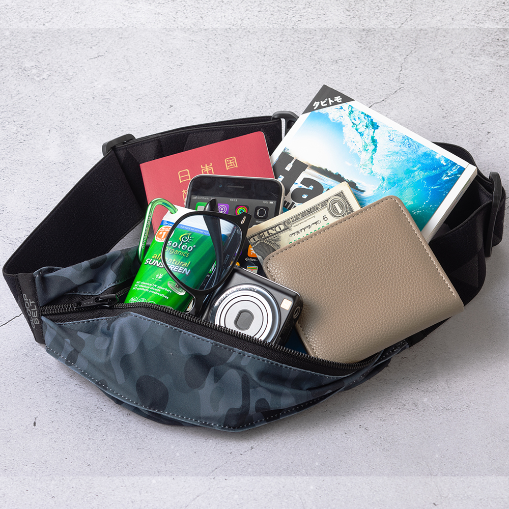 腰回りに巻き付けるだけでなく、肩から斜めがけするメッセンジャーバッグとしても使える大きめサイズ。