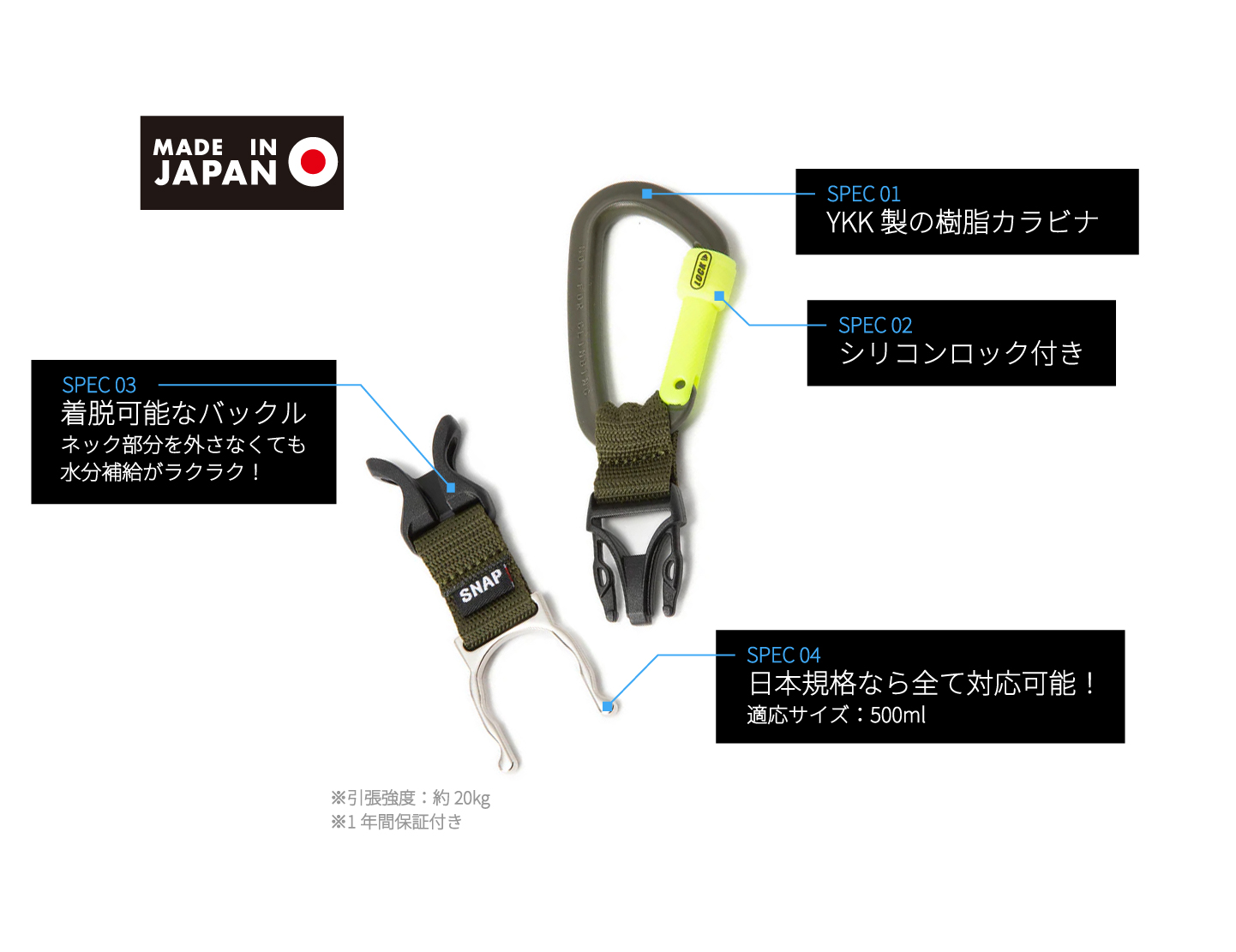 SNAP GEARは樹脂製の「カラビナ」と「バックル」、金属ホルダーが一体型になった商品です。